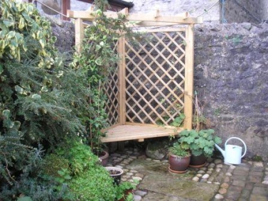 A corner arbour with combined seat provides a secluded spot to sit in the sunniest corner of the garden, whilst there is also room for a small table and chairs.